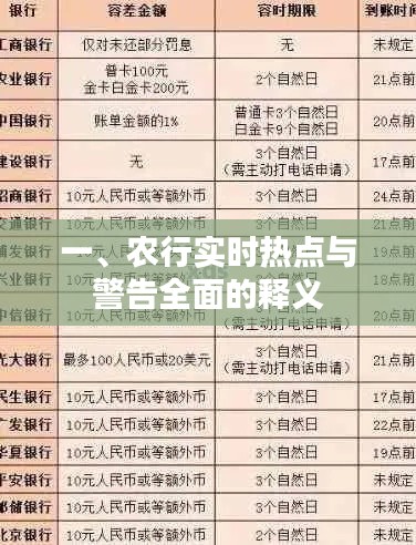 随着金融行业的快速发展,农业银行(以下简称农行)的实时热点和最新警告成为了公众关注的焦点,对此进行基础性与延展性的全面释义,旨在帮助公众更好地理解农行当前的动态与未来趋势。